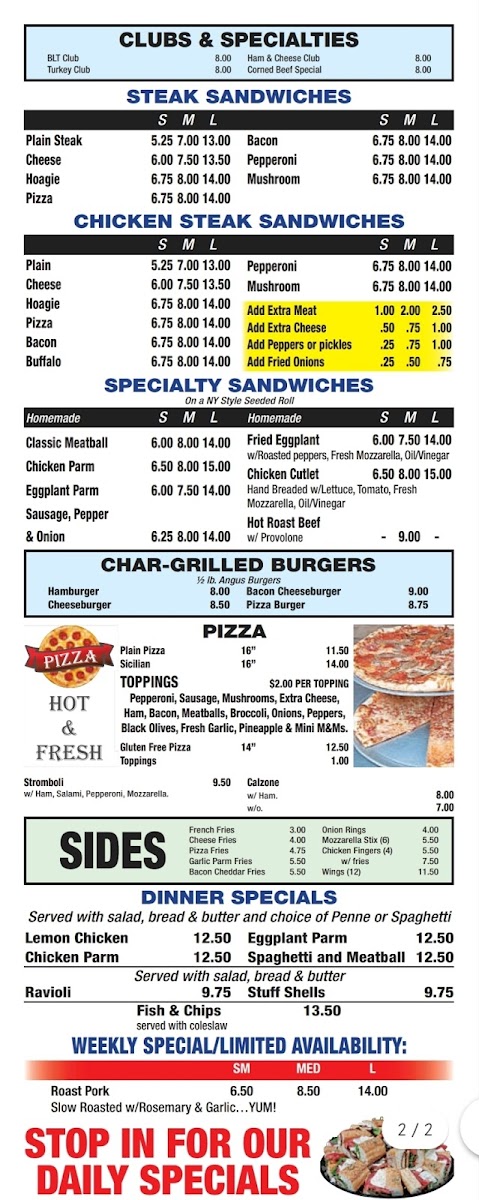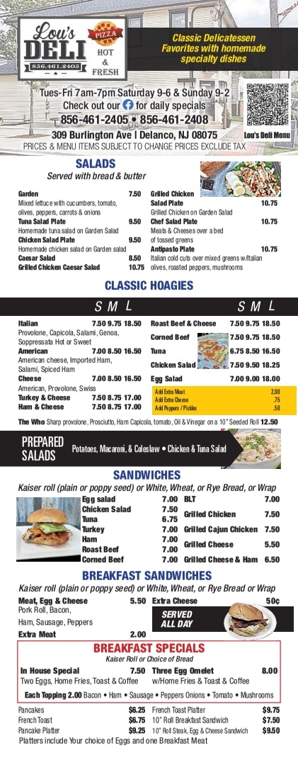 Welcome to Lou's Deli, a hidden gem located at 309 Burlington Ave, Delanco, NJ. This delightful deli specializes in hearty sandwiches, offering choices like the classic Egg Salad and Chicken Salad, available on fresh breads such as Kaiser and Rye, starting at just $5.00. Their clubs—the BLT and Turkey Club—are favorites among locals for only $7.00.